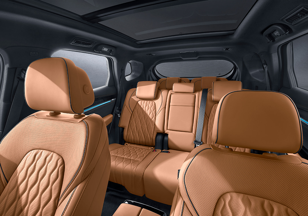 Bên trong Sealion 8 EV là không gian 3 hàng ghế (2+3+2) rộng rãi, bọc da Nappa cao cấp, táp-lô da lộn tinh tế và ánh sáng viền nội thất sang trọng.